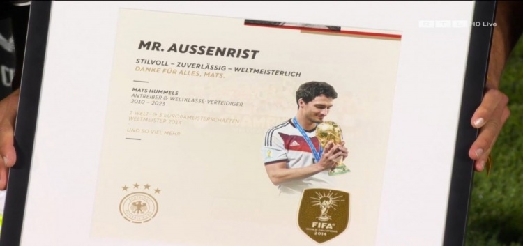 9月8日,德国国家队在主场进行的世界杯预选赛中迎战北爱尔兰。赛前,球队为刚刚宣布退役的后防名将胡梅尔斯举行了致敬仪式。